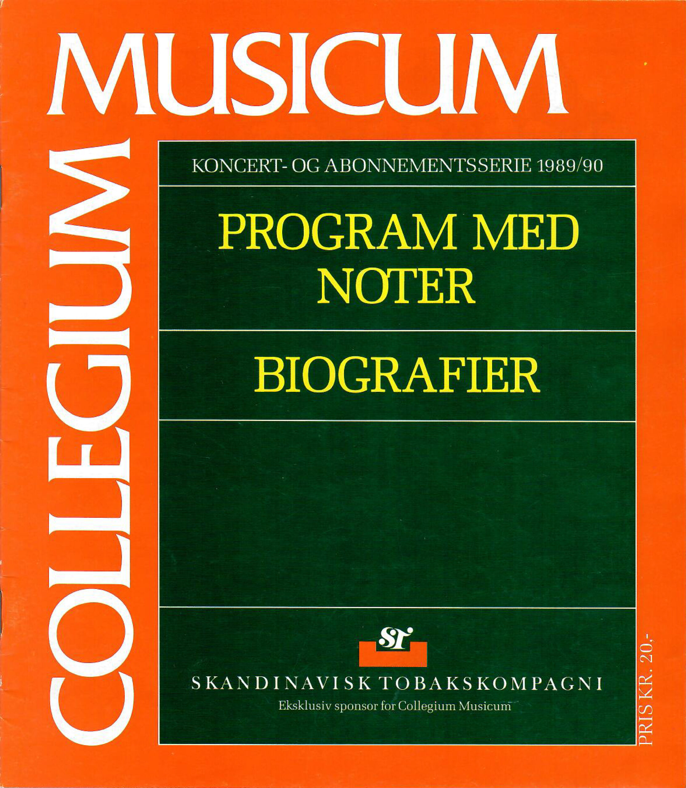 ”Vi byder Dem velkommen til Collegium Musicums 7. sæson i Odd Fellow Palæet. Nu sidder De godt, ikke sandt? Salens nyopstillede stole har fundet deres endelige pladser, og vi håber, De vil finde Dem tilrette og nyde de 5 koncerter, som vi, traditionen tro, har forberedt til Dem. I pausen vil De finde vej til orkestrets egen ”fonogrambutik” og efter koncerterne holder vi åbent i Den blå Foyer”, hvor De vil kunne tilbringe en afslappet stund i selskab med orkestrets musikere”.